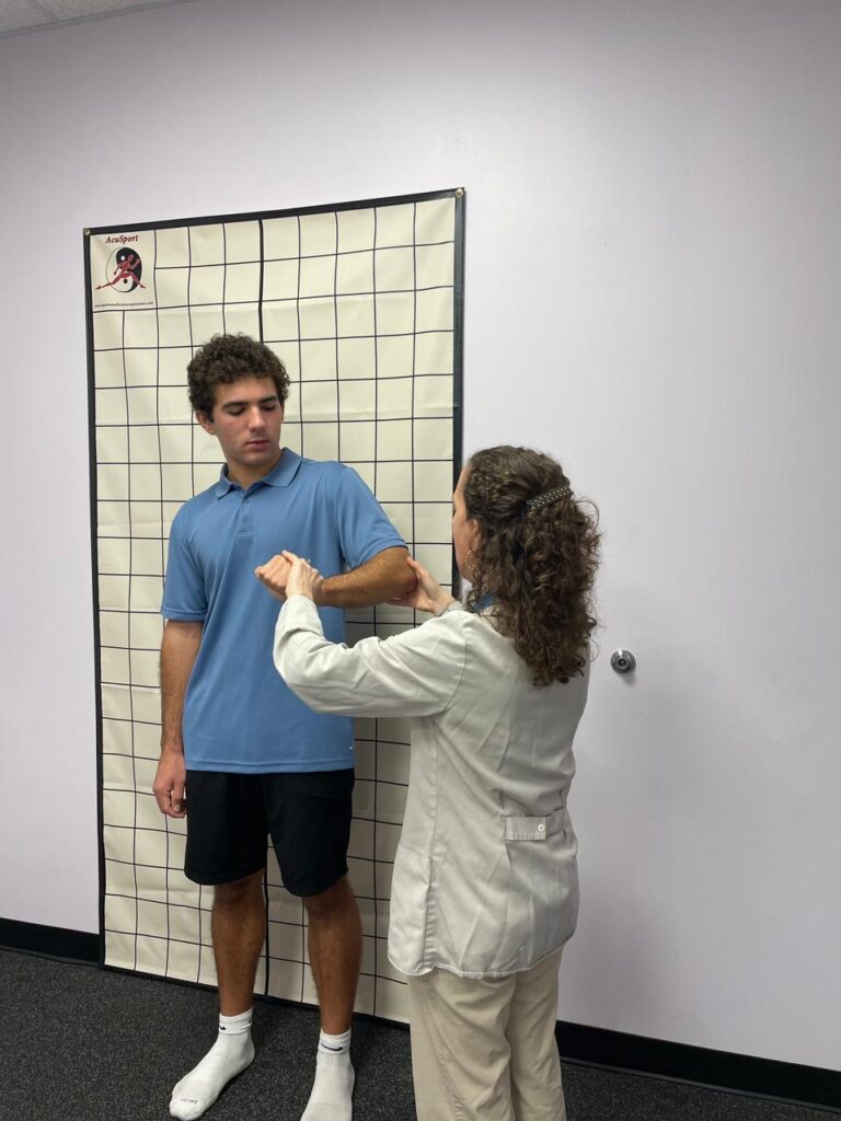 Performing an orthopedic assessment in front of a posture grid. This is a core component of Sports Medicine Acupuncture®